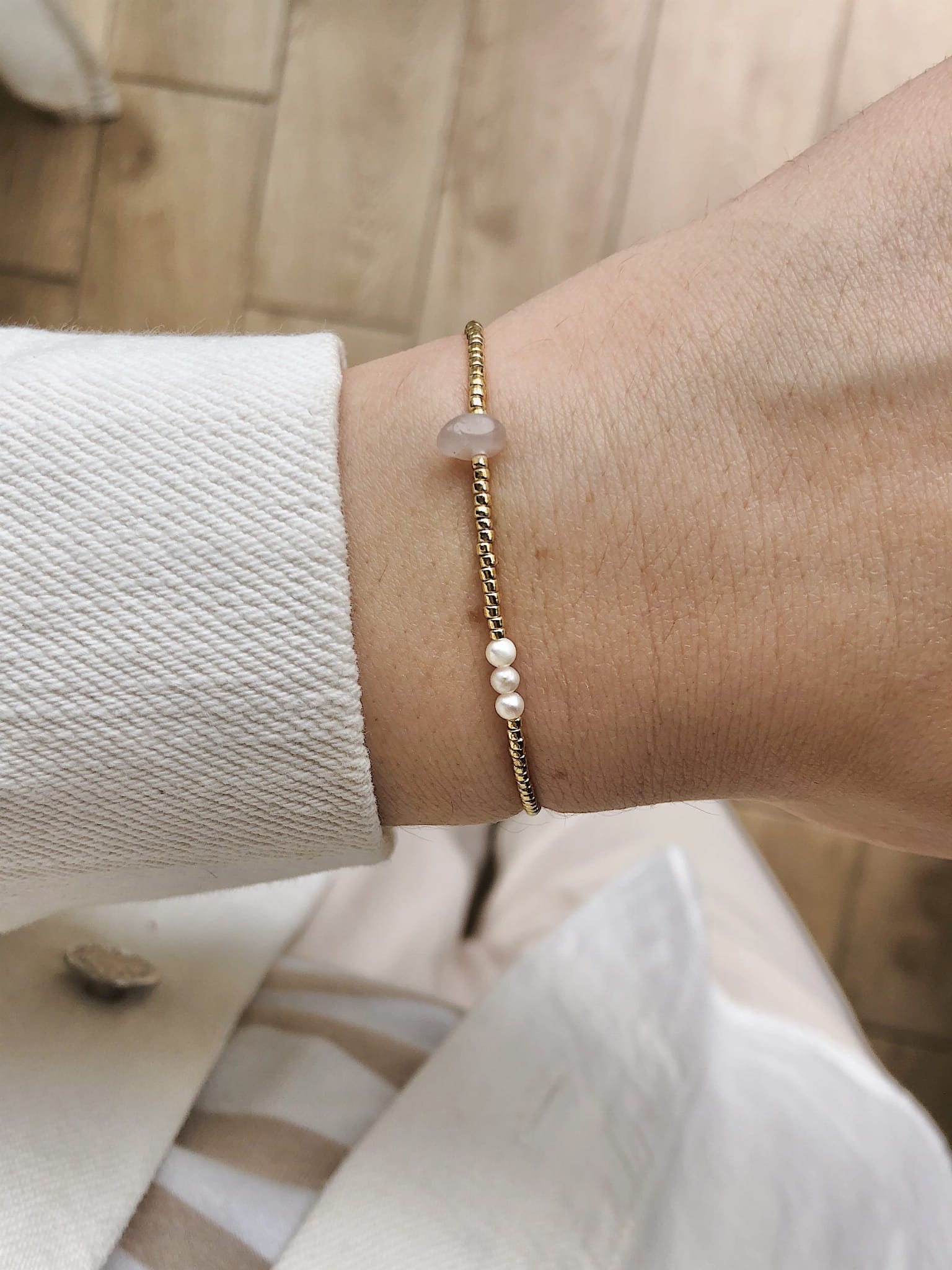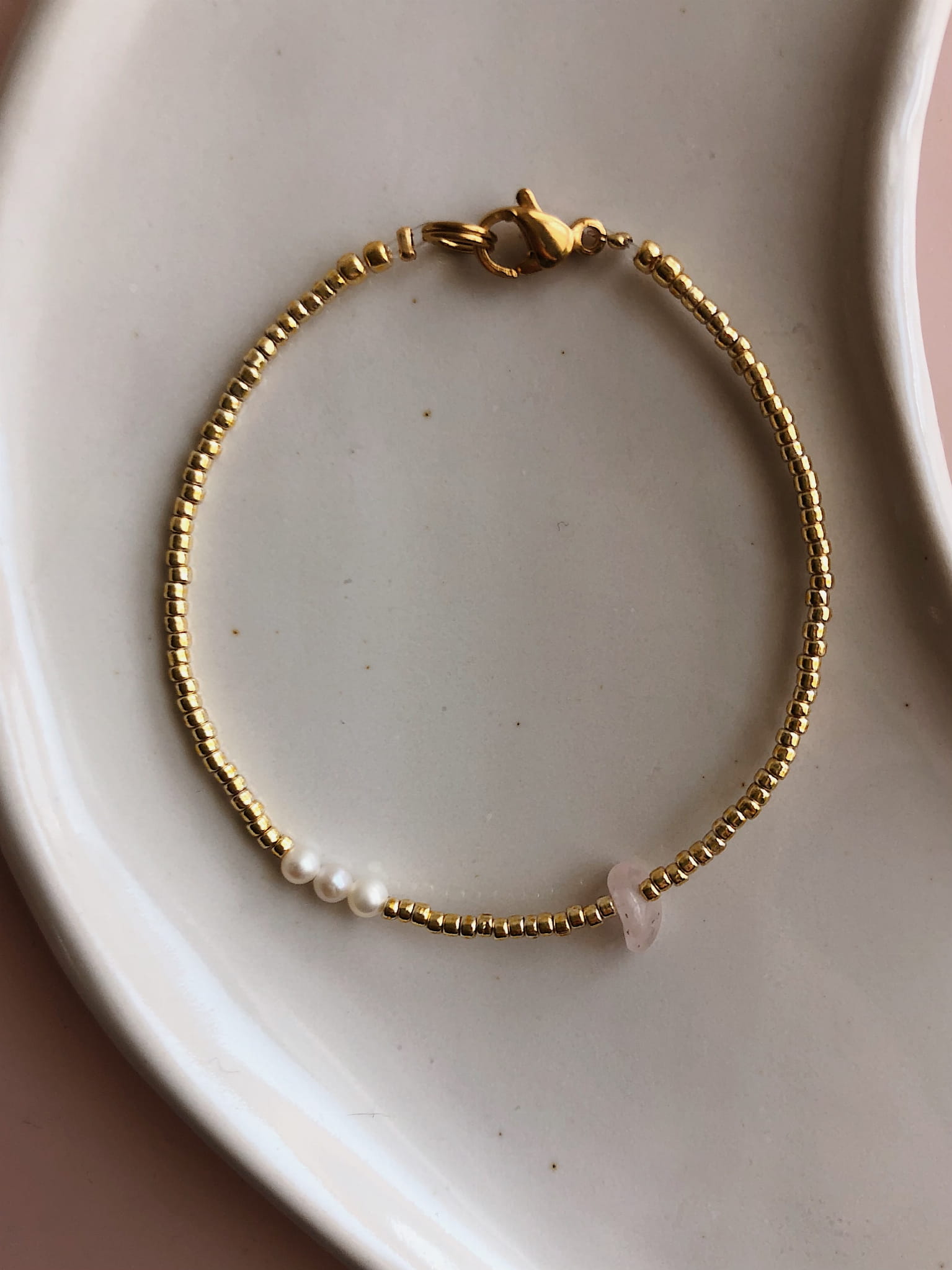 Bransoletka z koralików z dodatkiem perełek i kwarcu różowego.