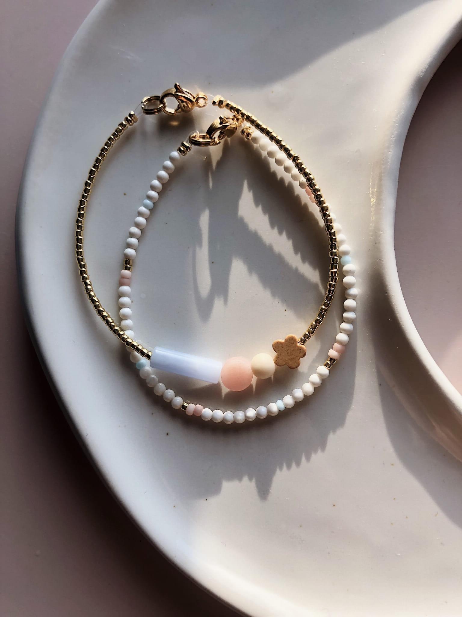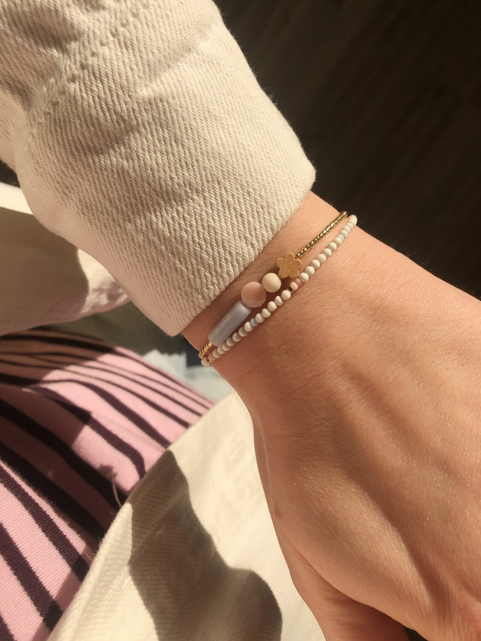Bransoletka z naturalnych kamieni HOWLIT, z dodatkiem koralików szklanych. Biel przełamana pastelowymi i złotymi akcentami :)