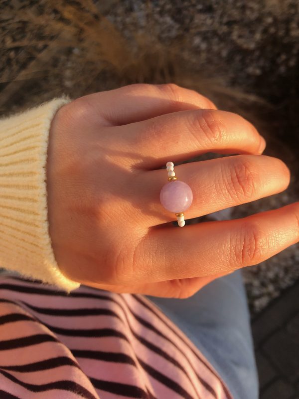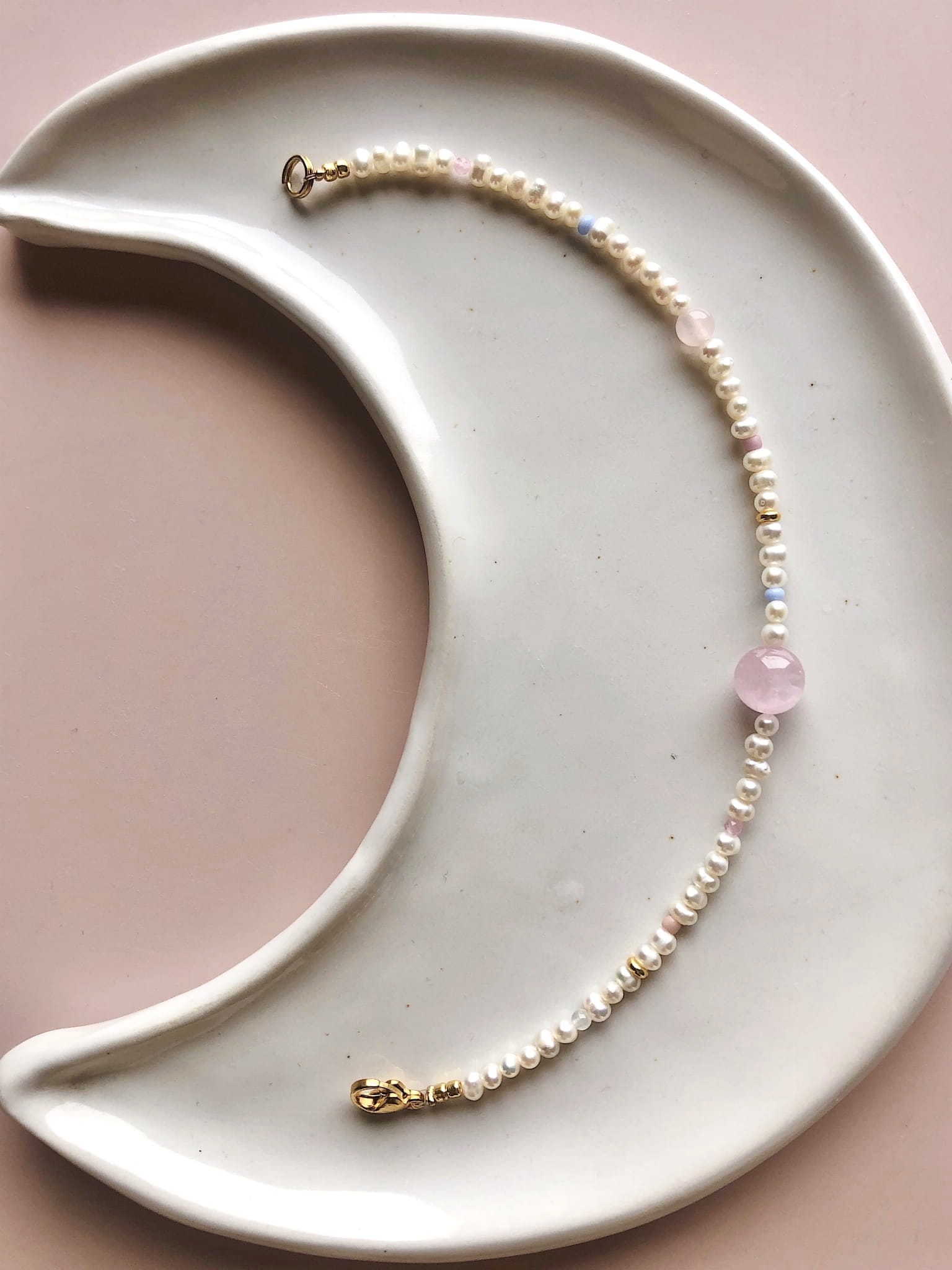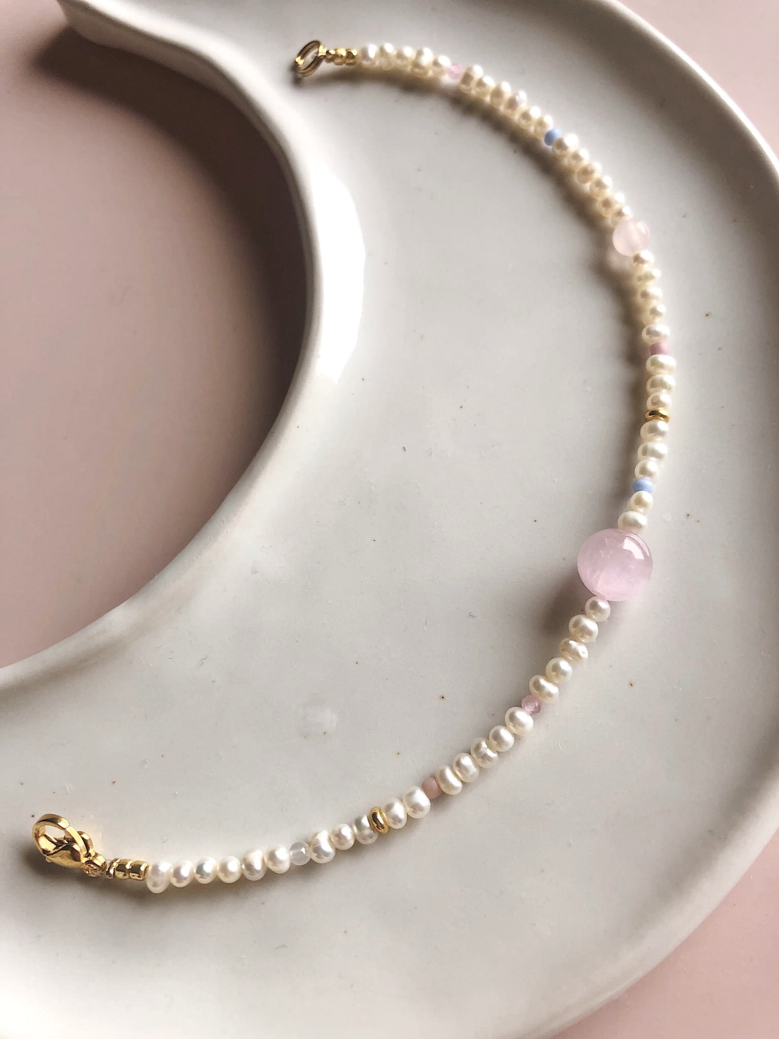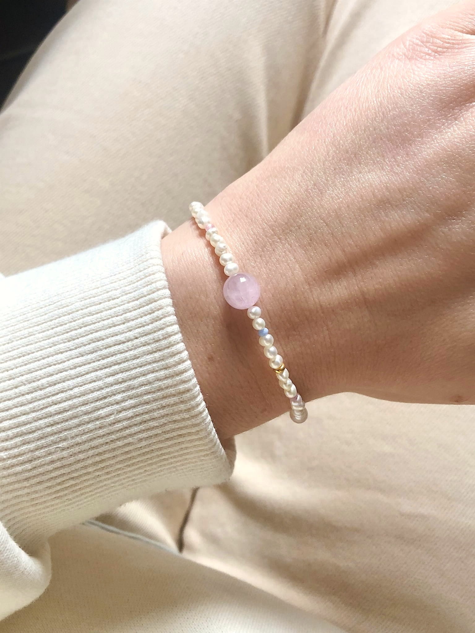 Bransoletka z pereł słodkowodnych, z dodatkiem kociego oka, jadeitu, kunzytu oraz koralików szklanych.