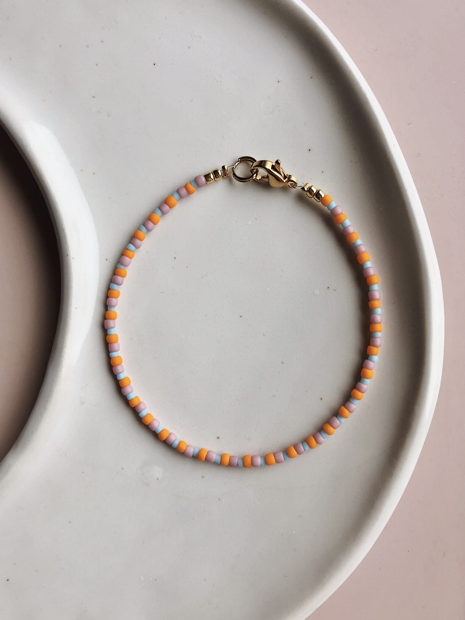 Bransoletka z koralików szklanych w trzech kolorach (pomarańcz, błękit, róż)..