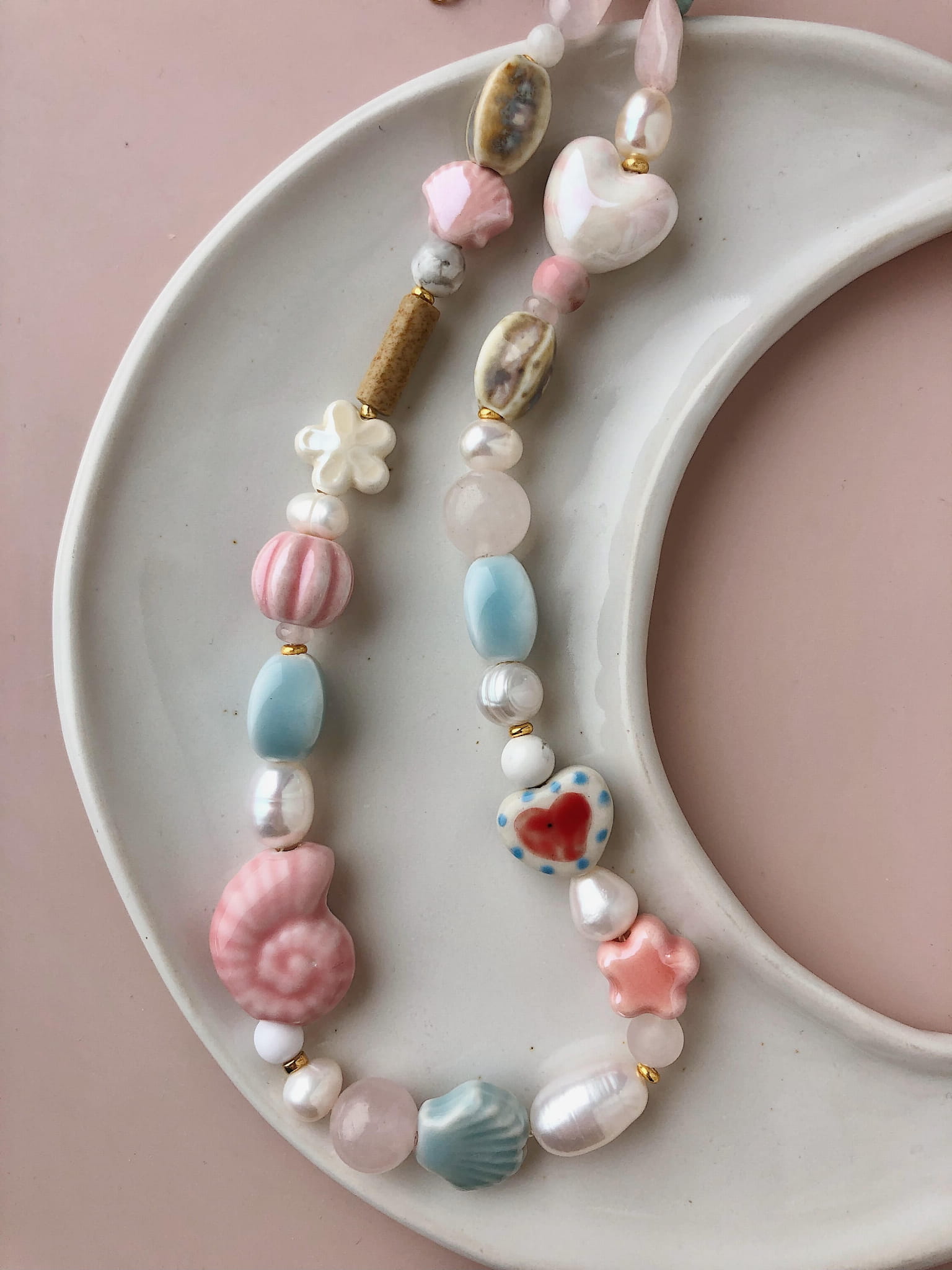 Naszyjnik w jasnych kolorach z mieszanki kamieni naturalnych, koralików szklanych oraz koralików ceramicznych.
