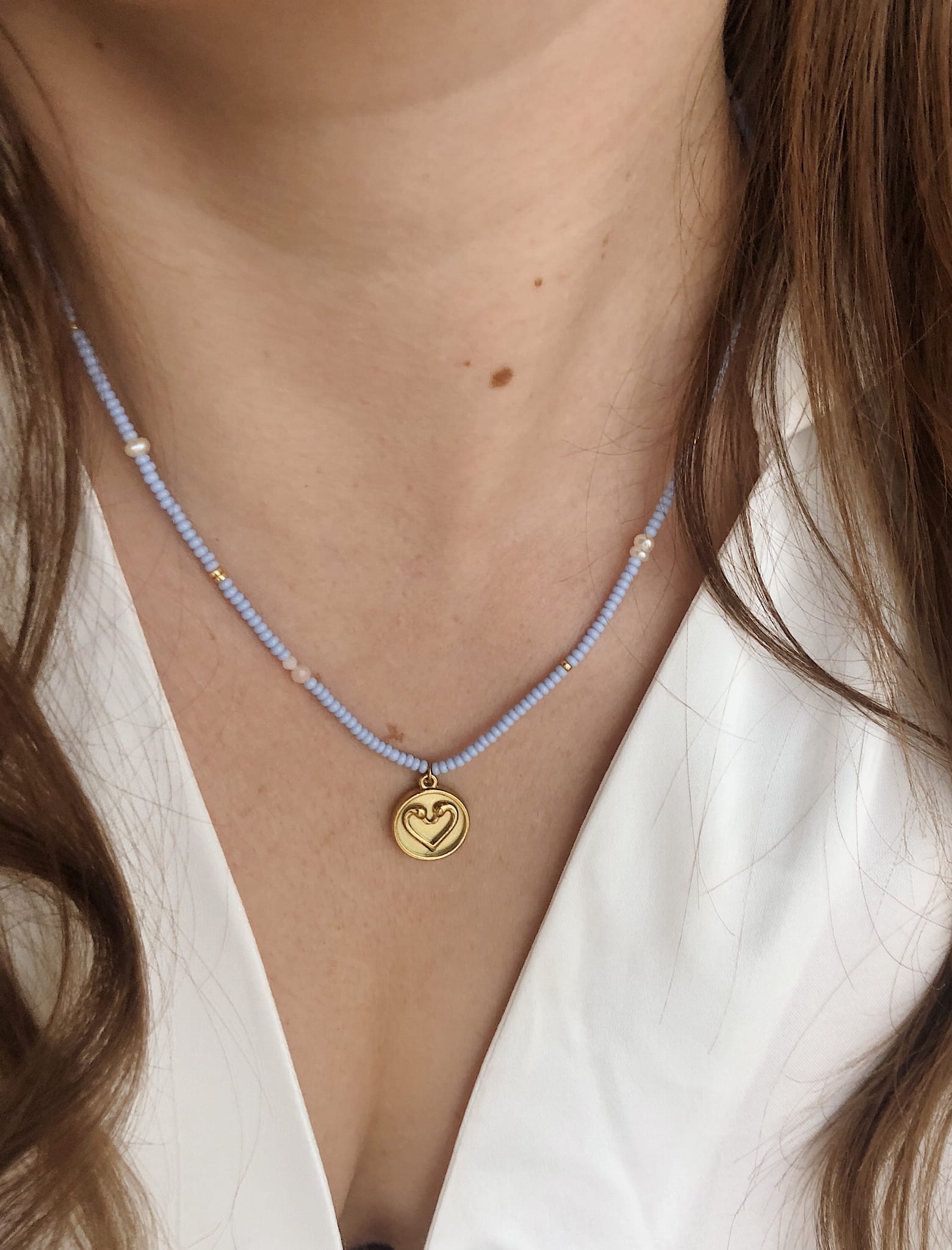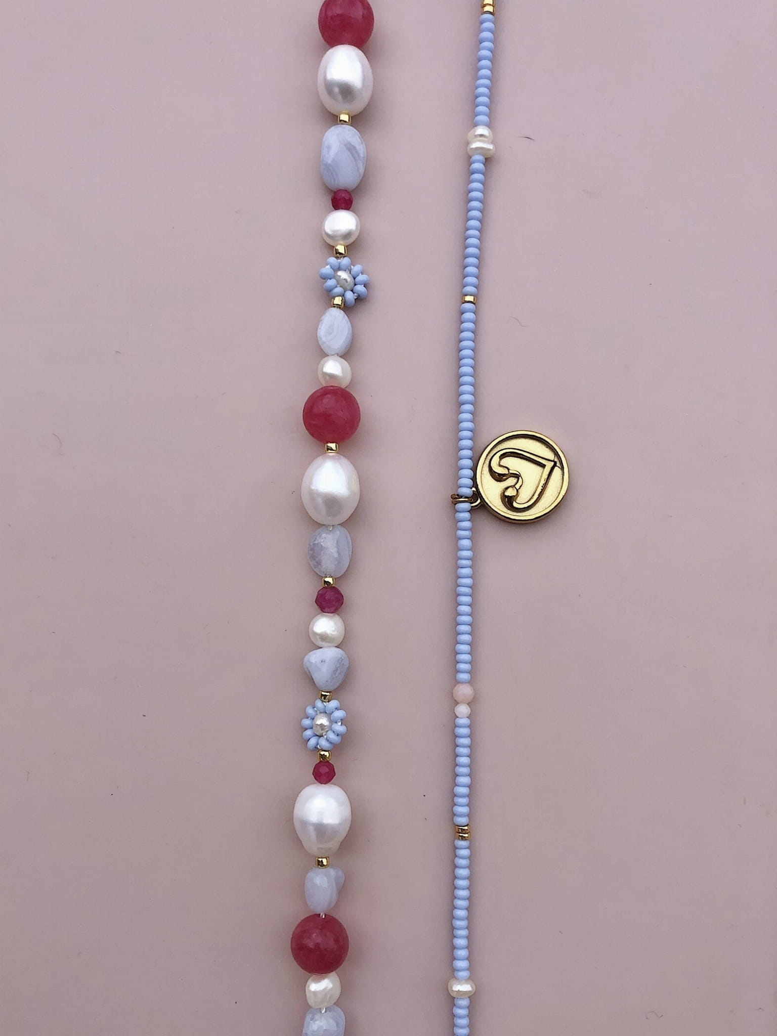 Naszyjnik z koralików szklanych z dodatkiem perełek słodkowodnych i różowego opalu.
