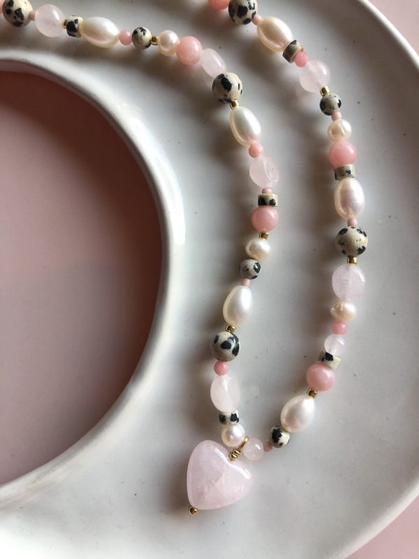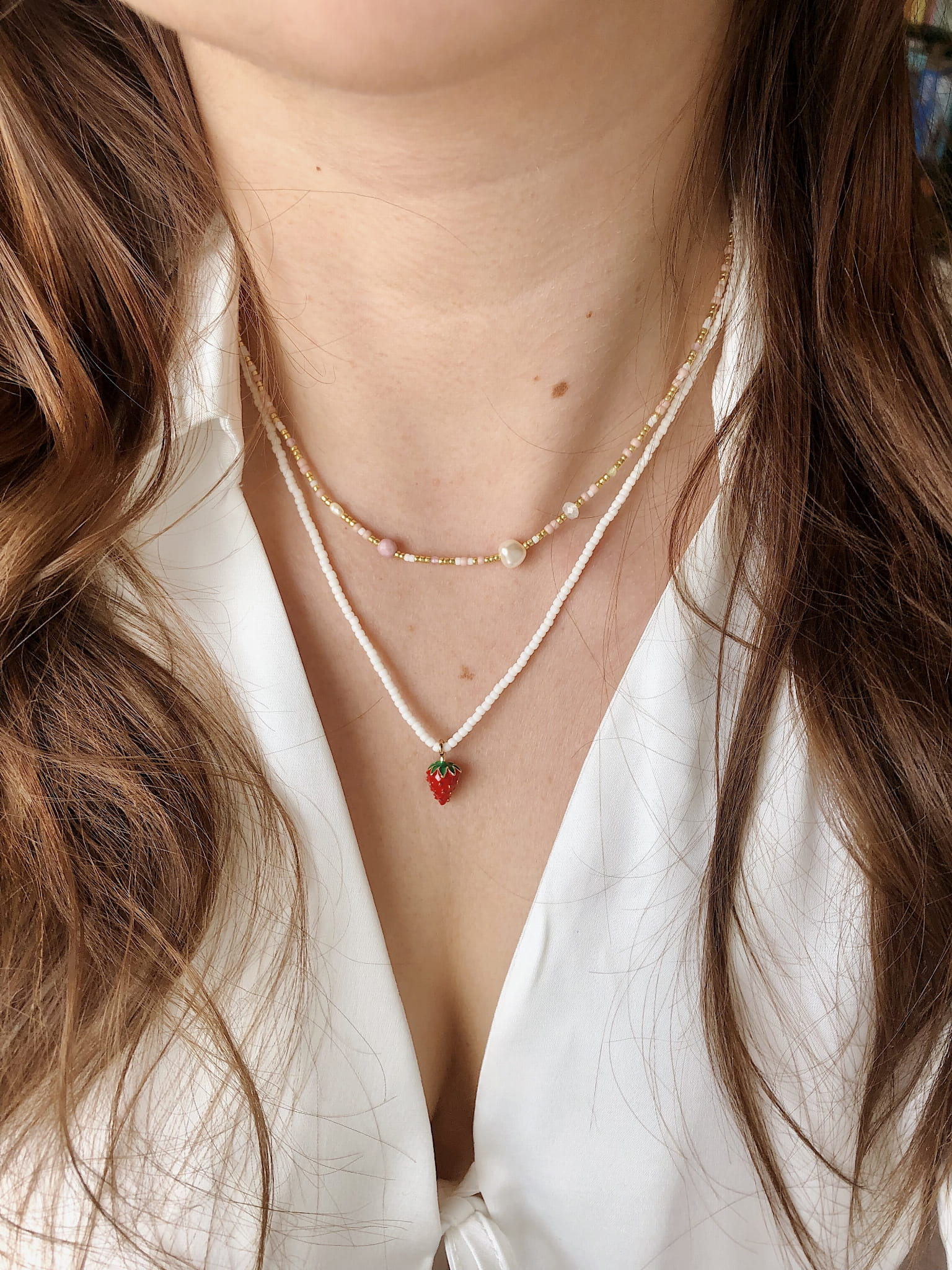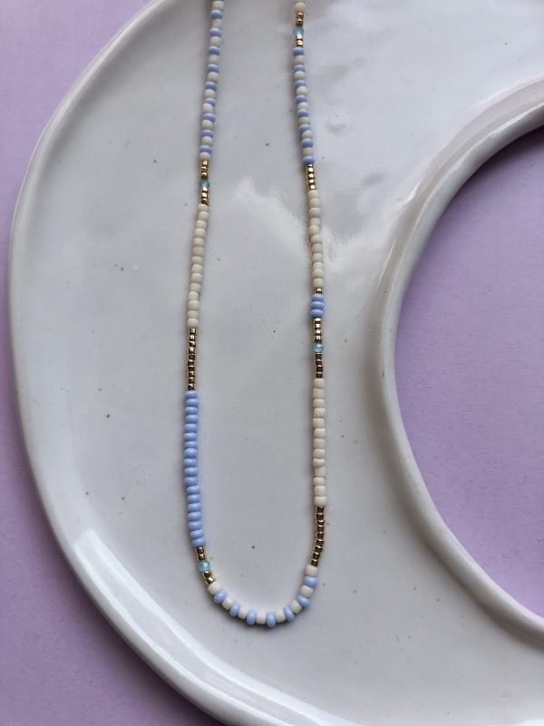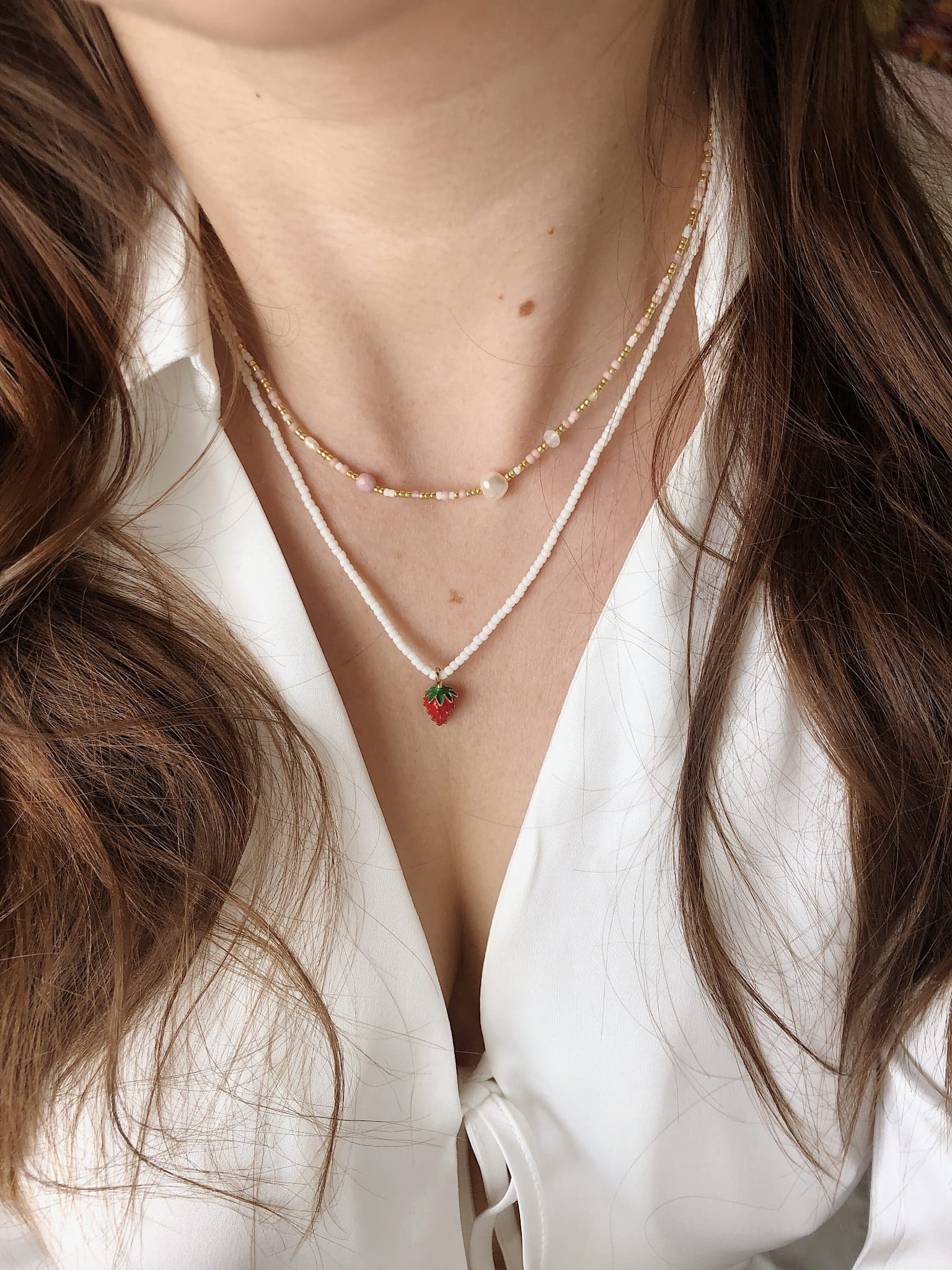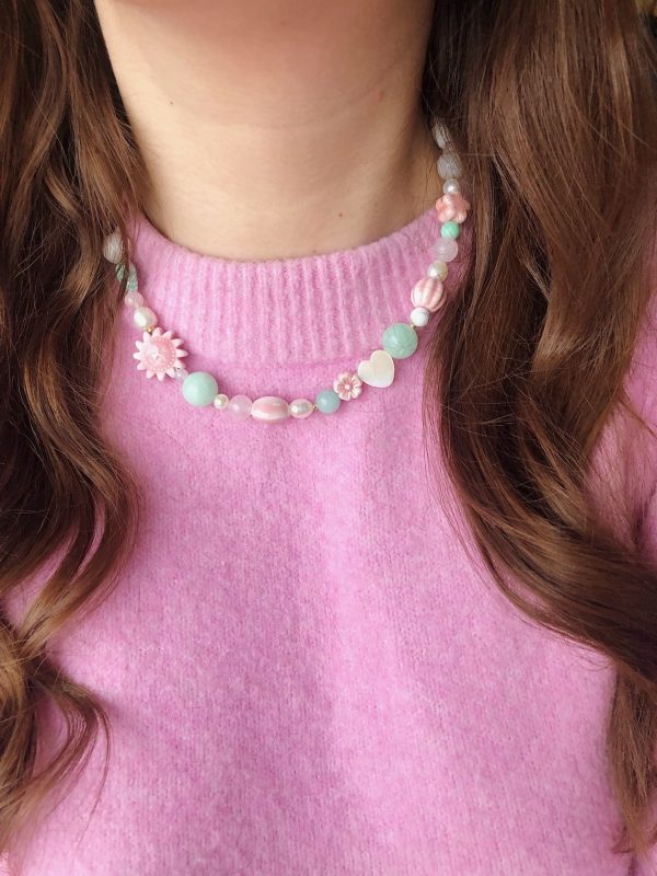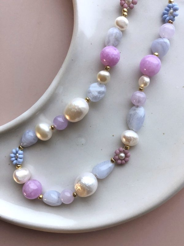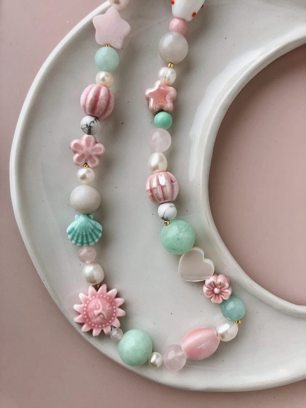Naszyjnik z koralików szklanych, z dodatkiem perełek słodkowodnych, kamienia księżycowego i kociego oka.