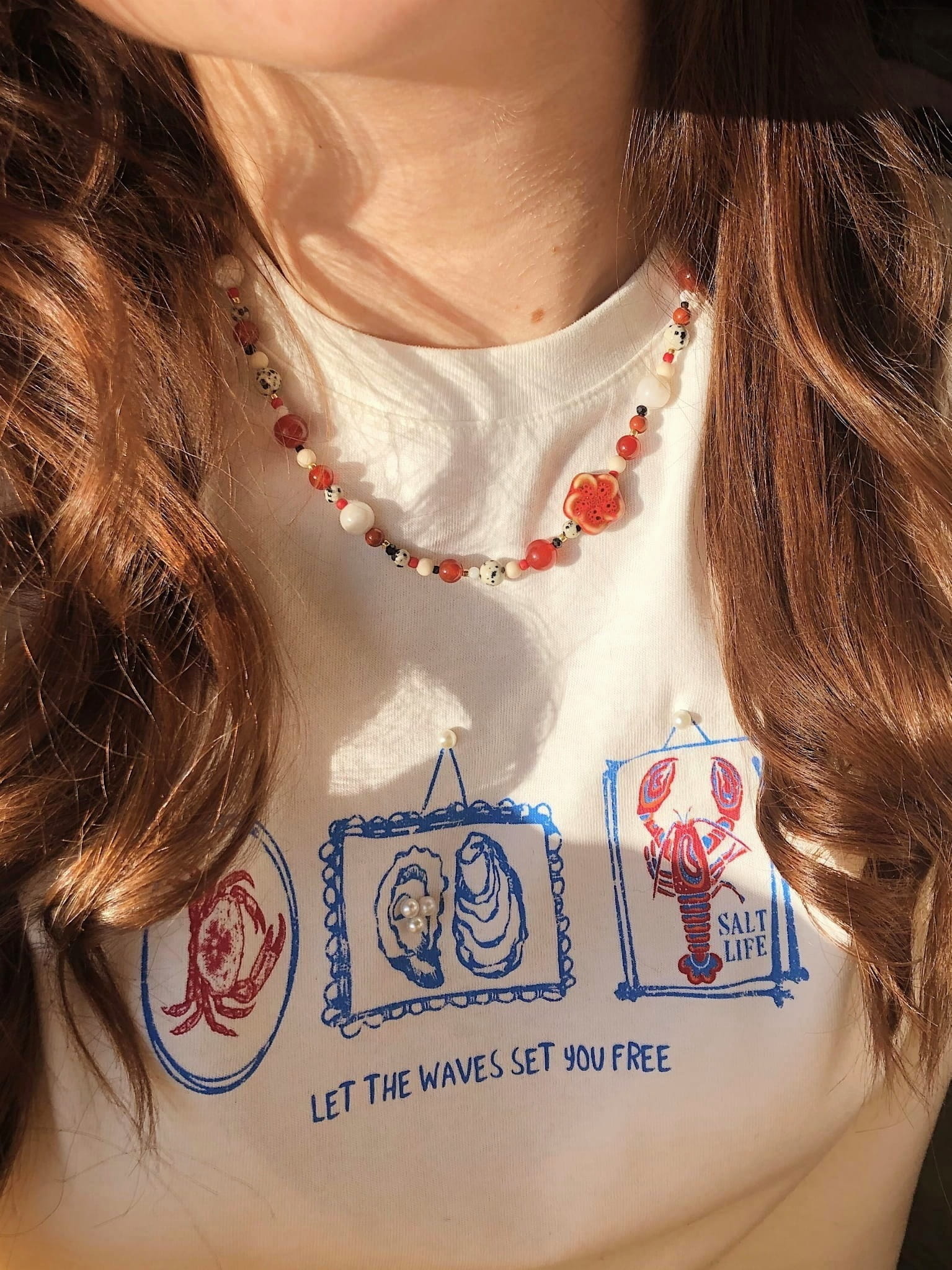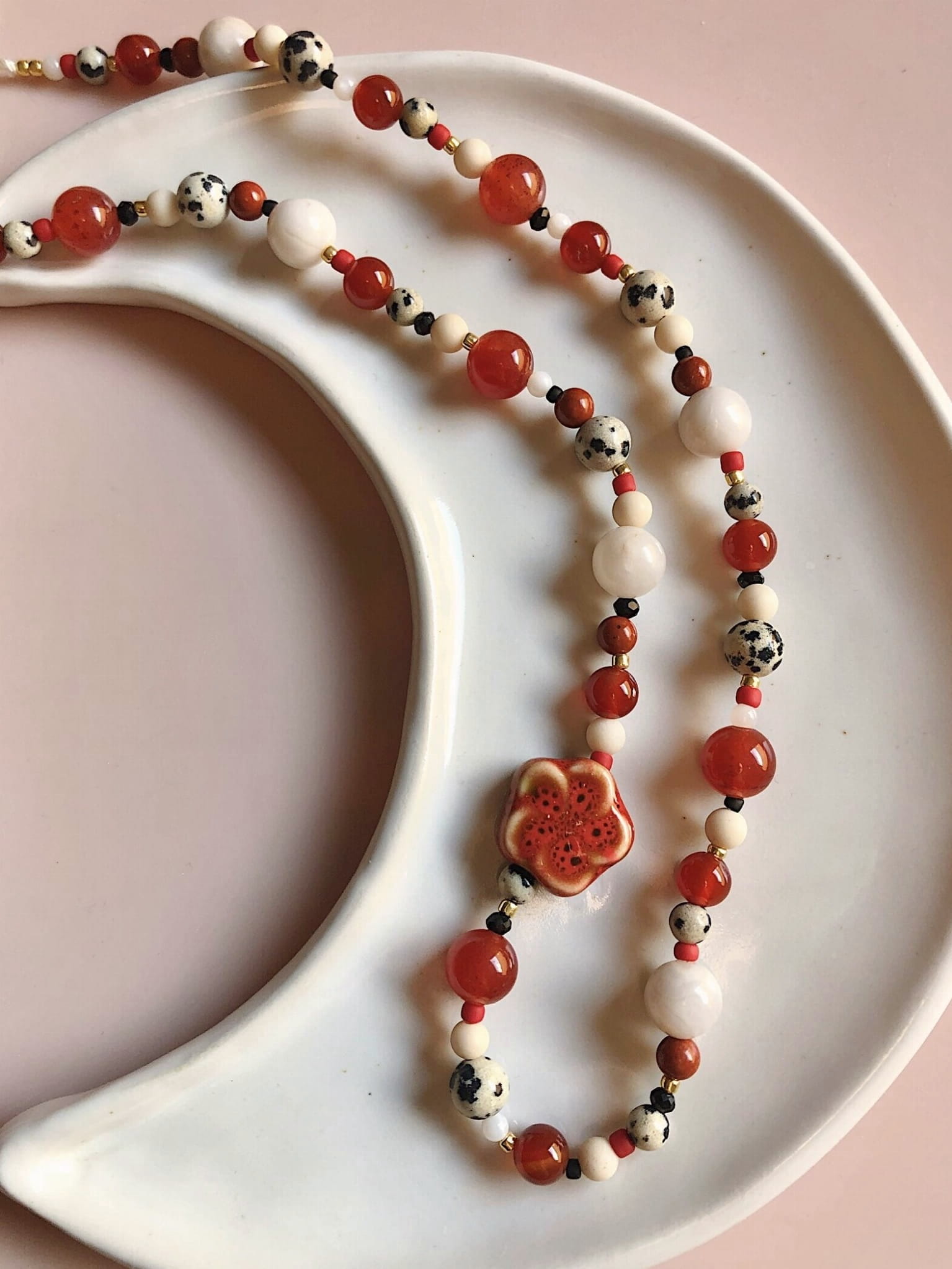 Piękny naszyjnik z kamieni naturalnych (jadeit, jaspis czerwony, jaspis dalmatyński, agat, kamień rzeczny), masy perłowej, z dodatkiem koralików szklanych. Naszyjnik zdobi piękny ceramiczny kwiatek <3
