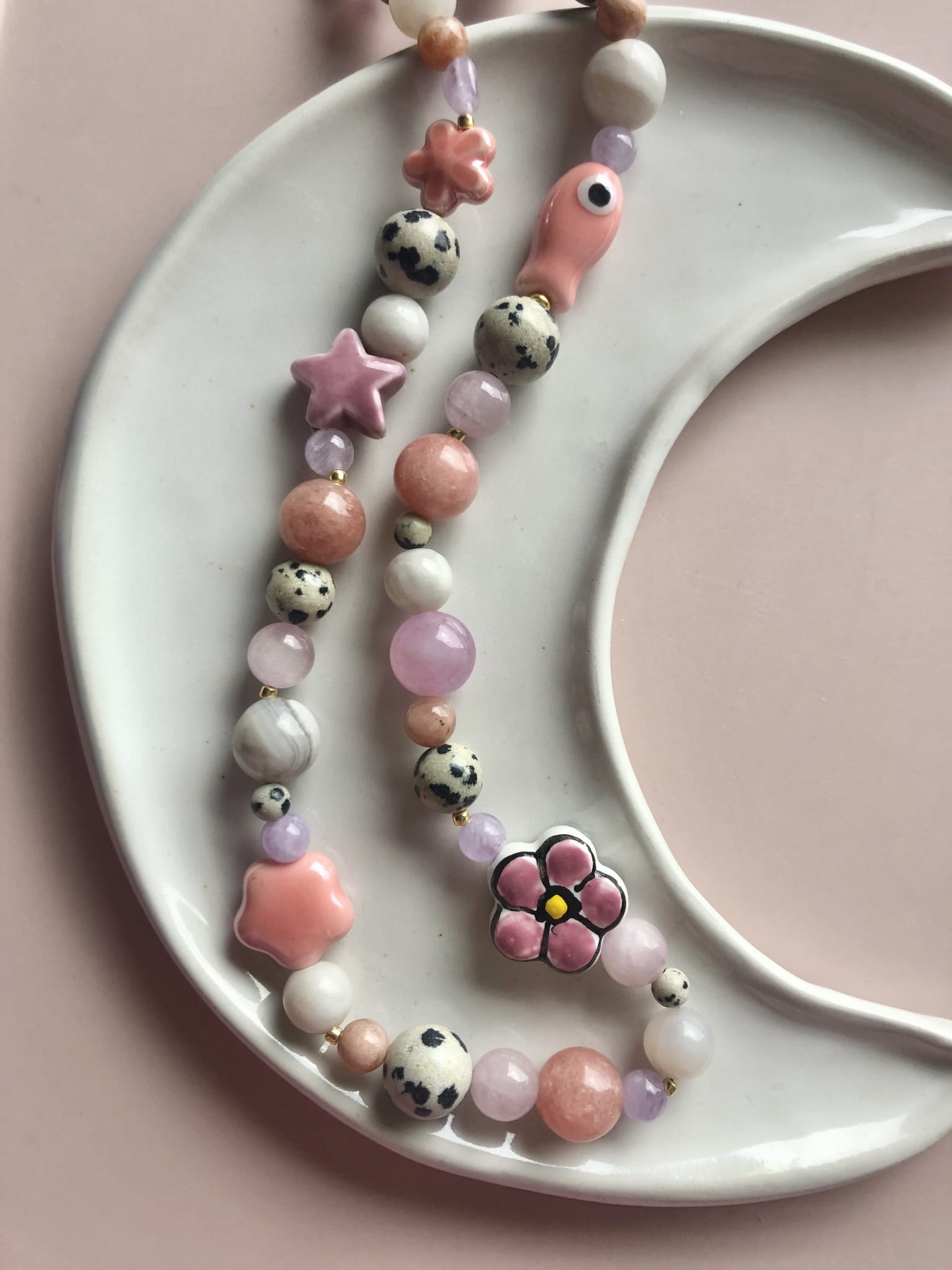 Naszyjnik z wiosenną energią, z mieszanki kamieni naturalnych, koralików szklanych oraz koralików ceramicznych.