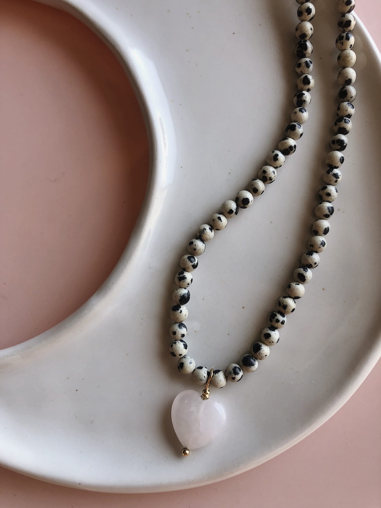 Naszyjnik z jaspisu dalmatyńskiego. Naszyjnik zdobi przepiękna zawieszka serce z kwarcu. Odcień serca może delikatnie różnić się od tego ze zdjęcia.