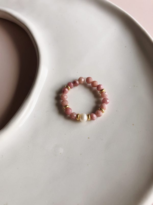 Pierścionek z kuleczek ze stali chirurgicznej, z dodatkiem agatu, jaspisu dalmatyńskiego oraz perły hodowlanej.